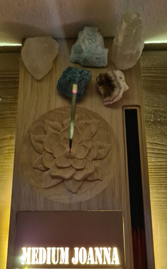 Mooie massief eiken wierook houder met led verlichting, uw naam en of bedrijfsnaam en apart vak voor uw wierookstokjes. 20x27,5 cm €99,-